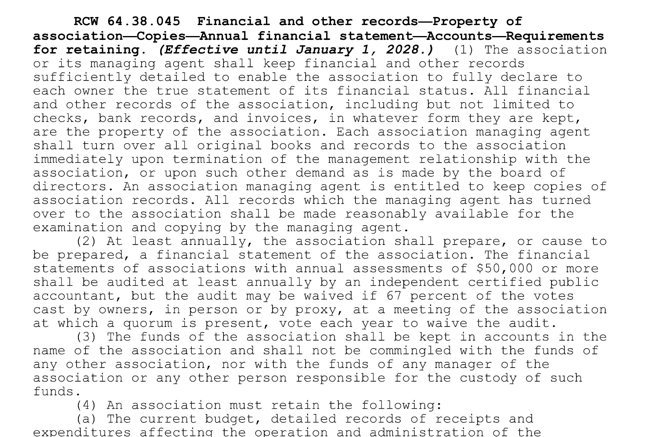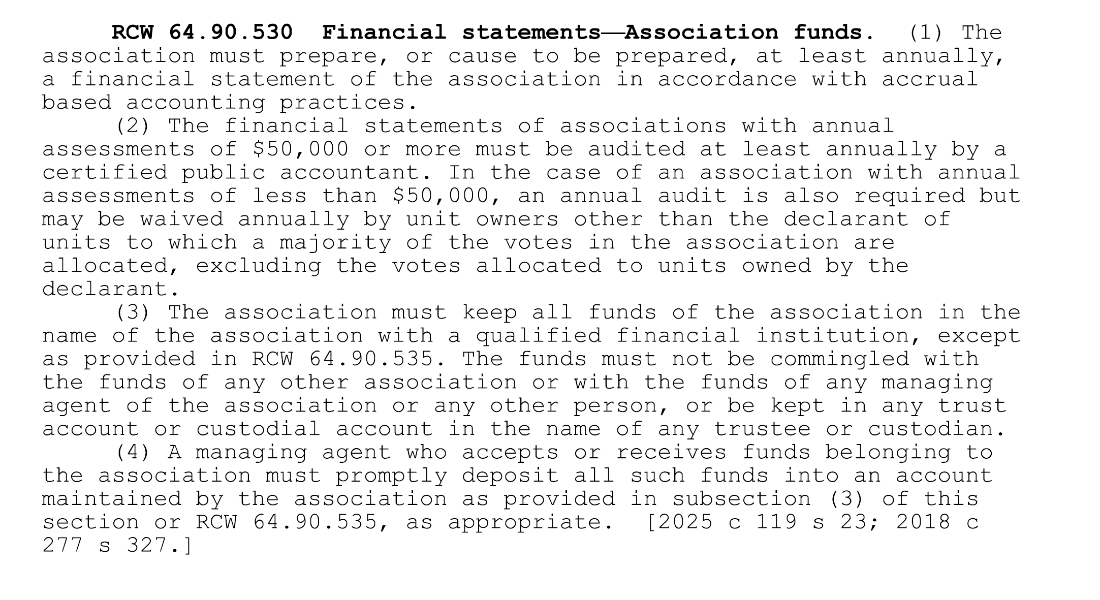 The annual assessment for the Belfair Acreage Tracts Association is determined through a budget ratification process. RCW 64.90.525 (effective July 2018). The Board creates a proposed budget for the next year and if a majority of property owners do not reject it, then it is ratified.